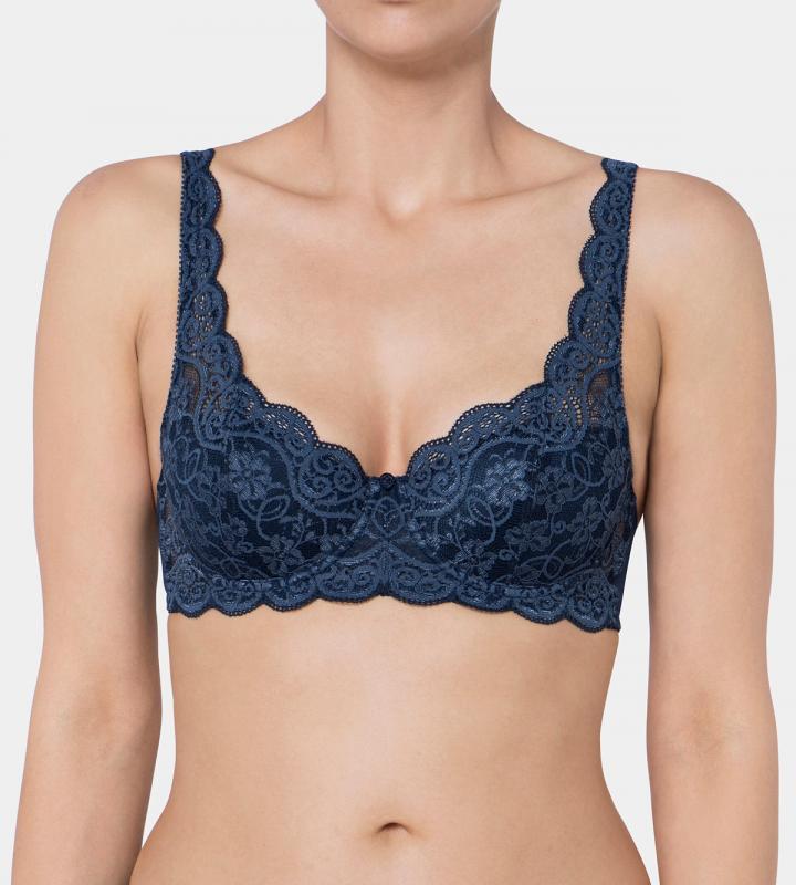 Sutien din gama Amourette 300, cu armatura si captuseala in jumatatea de jos a cupelor, o taietura verticala a cupei si punte inalta care asigura sustinere si un format deosebit pentru san.