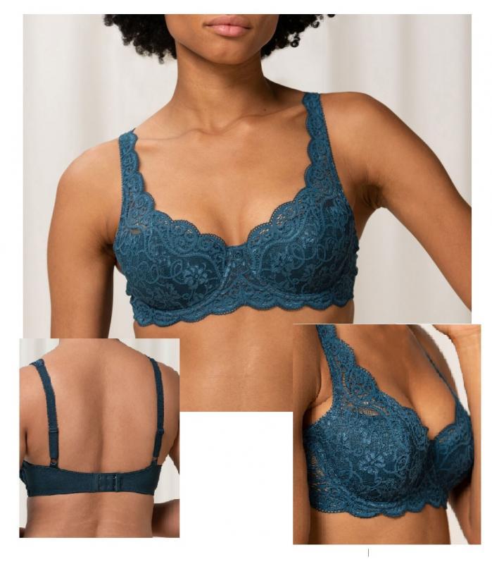Sutien din dantela si broderie, cu armatura si burete simplu in jumatatea de jos a cupei, un model extraordinar de frumos si elegant care ofera in acelasi timp sustinere pana la cupe si circumferinte mari.