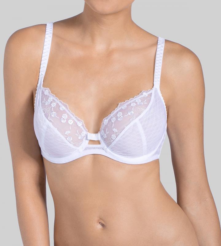 Sutien superb , cu armatura si broderie pe jumatatea superioara, cu o croiala a cupei si bretelelor adaptata sustinerii pana la cupe mari.
