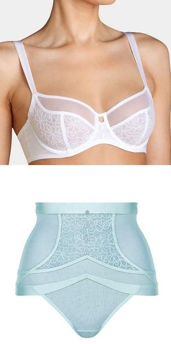 Set din dantela si broderie: sutien cu armature si cupe simple, fara captuseala, chilot talie inalta cu proprietati de modelare si decoltat la spate (string).
