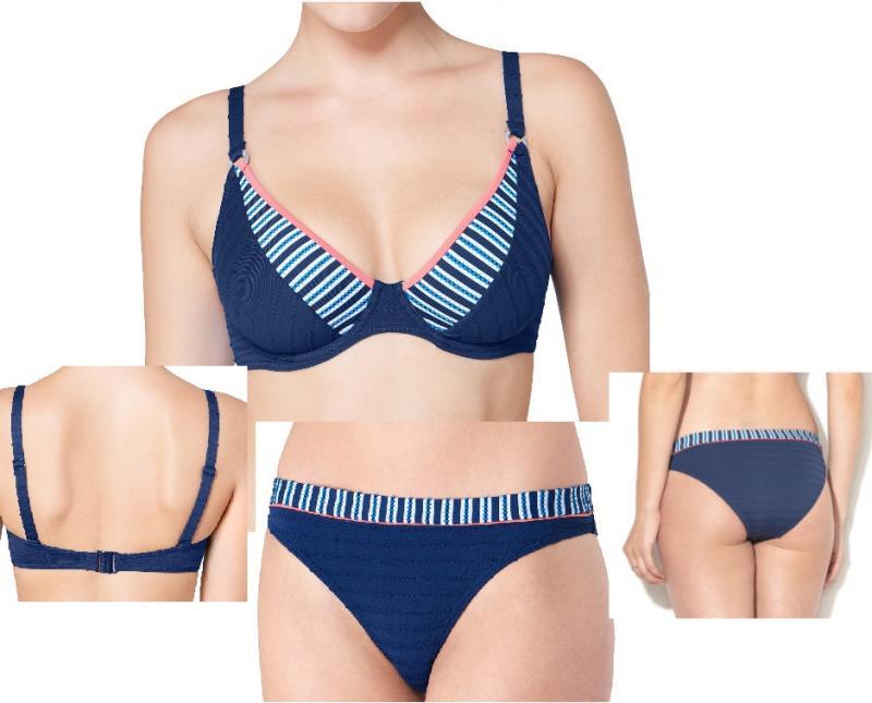 Costum de baie din 2 piese: material cu proprietatea de uscare rapinda, sutien cu inchidere clasica si armatura, cupe simple fara captuseala, slip croiala clasica la spate.