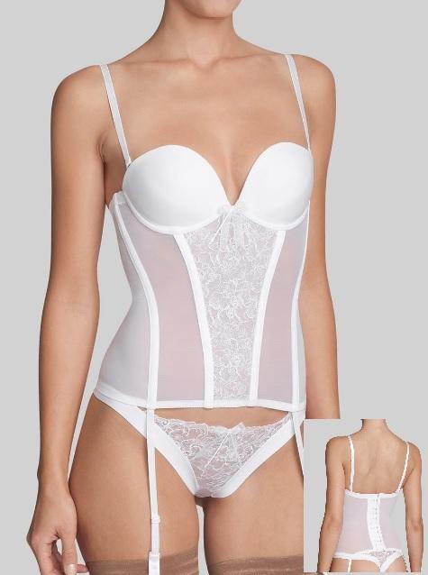 Corset cu balene, avand sutienul cu armatura si un usor push-up, broderie in partea din fata unde portiunea are si proprietati usoare de modelare, jartiere pentru prinderea ciorapului. Buretele de push-up este detasabil.