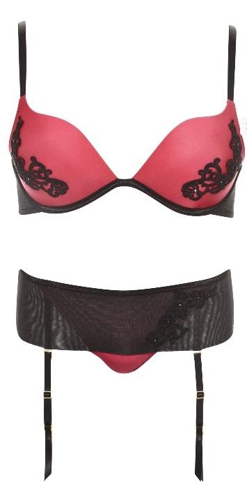 Set din gama de lux, elegant si foarte feminine format din sutien cu armatura si push-up, chilot hipster cu prelungire pt portjartier. Prelungirile sunt detasabile.