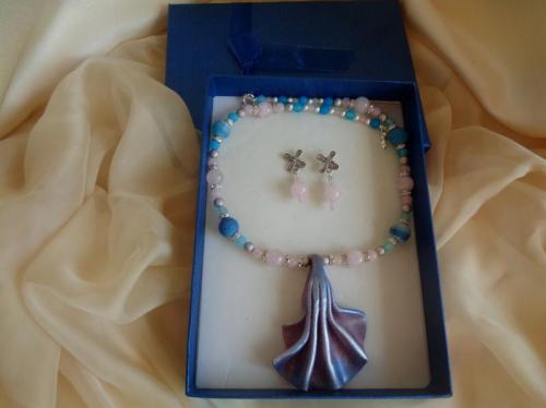 Set colier si cercei, din cristale de quartz roz, agat bleu si pandantiv ceramic