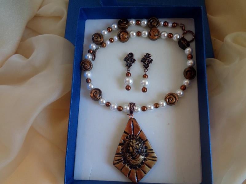Set colier si cercei, din perle Mallorca, elemente ceramice si cupru.
