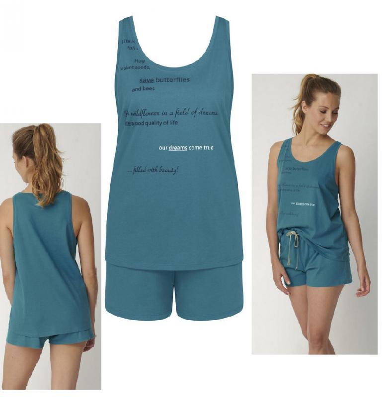 Pijama cu pantalon scurt si bluza fara maneci, 100% bumbac organic, un material deosebit de placut la purtare ce te face sa te simti rasfatata. Cine spune ca acesta nu poate fi purtat si ca set de casa pe parcursul zilei?