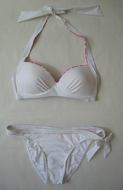 Costum de baie avand sutienul fara armatura, cupe usor captusite cu inchidere dupa gat. Slipul este croiala clasica, ingust pe solduri, fundita este aplicata.