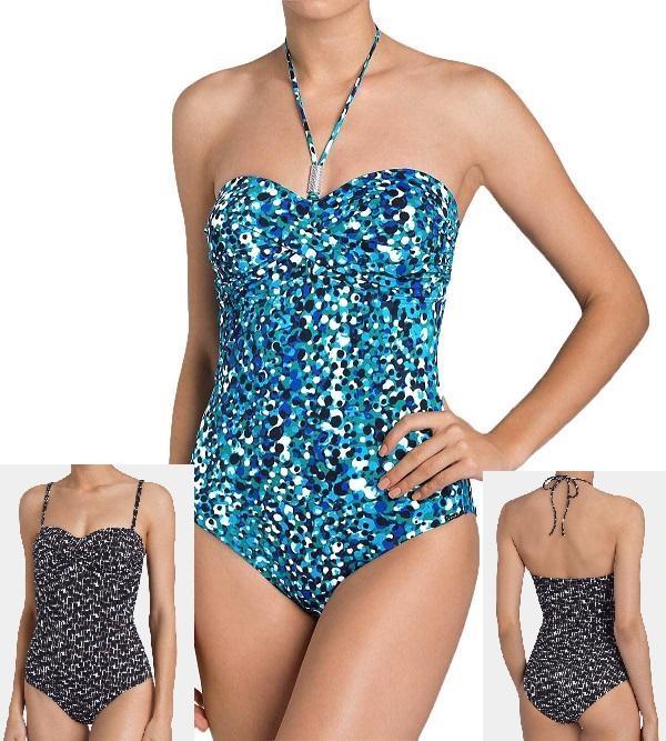 Costum de baie intreg, deosebit de elegant, fara armatura, cu o singura bretea dupa gat sau cu bretele clasice, decoltat la spate pana la linia sutieului. Cupele au o captuseala usoara pentru a asigura sustinerea sanului. iar la spate slipul are taietura clasica.