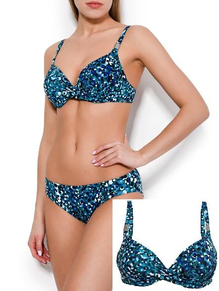 Costum de baie din doua piese intr-o combinatie splendida de nuante si culori. Sutienul are armatura si cupe captusite pentru a asigura sustinerea si confortul pana la marimi mari. Slipul are croiala clasica la spate si talie semiinalta.