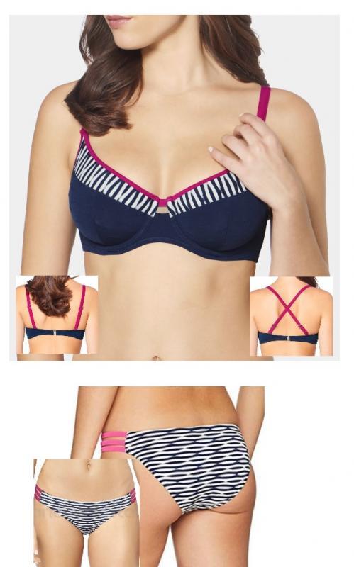 Costum de baie din 2 piese: sutien cu armatura si cupe simple, fara burete sau captuseala, bretele care se pot prinde in mai multe forme la spate, slip care se prinde cu 3 benzi elastice in fiecare laterala, talie semijoasa.