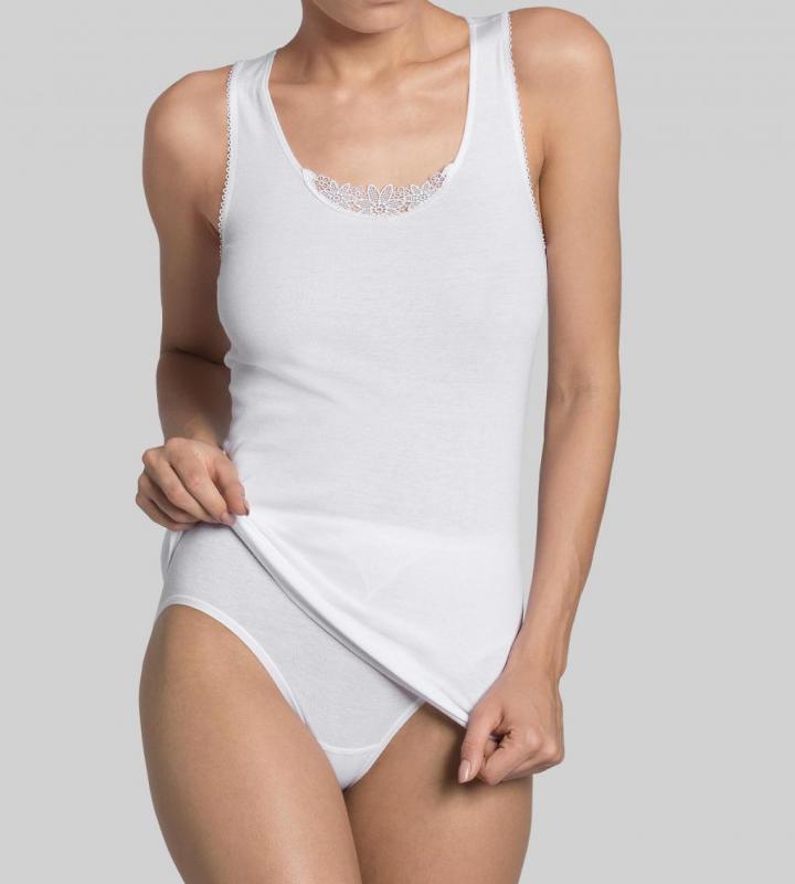 Acest produs este epuizat. Va rugam sa ne contactati pentru alegerea unui produs similar.Maiou din bumbac 100%, cu bretea lata, cu o garnitura din dantela iin jurul decoltului rotung pentru un aspect feminin. Calitatea foarte buna a bumbacului ofera o senzatie placuta pe piele.